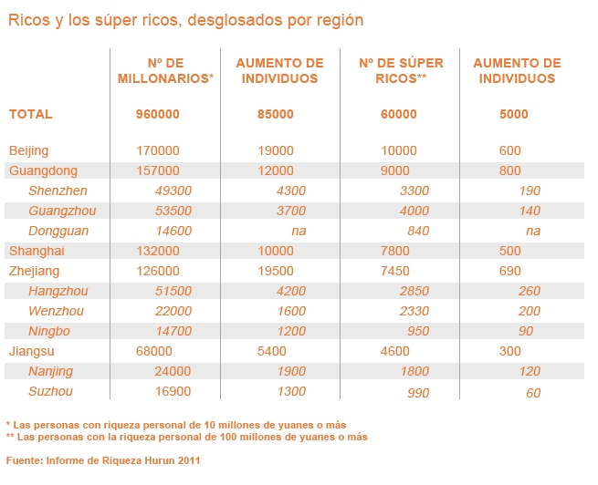 Según el Informe Hurum Riqueza 2011, de esta misma revista, hasta abril de 2011 China contaba con 960.000 millonarios, un 9,7% más que los 875.000 registrados el pasado año, y un aumento del 16,3% respecto a los los millonarios de 2009 (825.000). Otro grupo que también ha aumentado su tamaño son los multimillonarios del país asiático, aquéllos que poseen un patrimonio superior a los 100 millones de yuanes (10,8 millones de euros), esta élite a vuelto a crecer en los 4 primeros meses de 2011, situando la cifra de los más acaudalados del país en 60.000 personas.