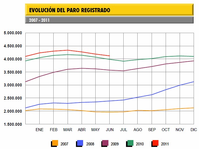 De este modo, España registró un total de 4.121.801 desempleados en junio, según el Ministerio de Valeriano Gómez. Se trata de la tercera caída del desempleo desde diciembre de 2010, cuando bajó en 10.221 personas. La secretaria de Estado de Empleo, Mari Luz Rodríguez, se agarró a estos datos para subrayar que se trata de una "buena noticia". De hecho, destacó que la reducción del desempleo en los tres últimos meses, en casi 212.000 personas, supone "el mejor comportamiento del paro registrado en un trimestre de toda la serie histórica".