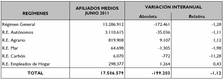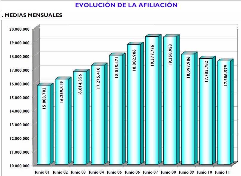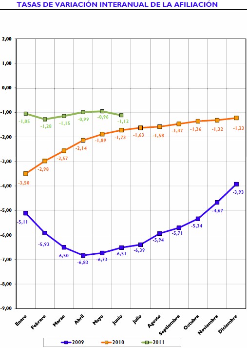 La afiliación media baja un 1,12% a nivel interanual, lo que supone 199.203 puestos de trabajo destruidos con respecto a junio de 2010. Se trata del primer mes en el que la Seguridad Social pierde afiliados, tras tres meses en positivo y después de que retrocediera siete meses consecutivos.