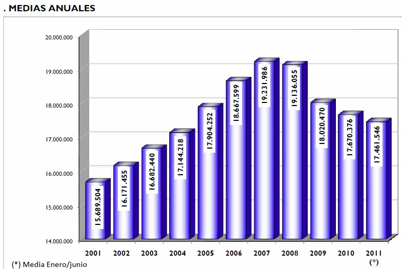 El número de afiliados baja en 196.995 personas respecto a junio de 2010, una caída interanual del 1,11%. En resumen, España sigue destruyendo empleo, tanto a nivel intermensual como interanual, mientras que el paro sigue subiendo en términos homogéneos -una vez eliminado el tradicional repunte de contratos propios de la temporada turística-.