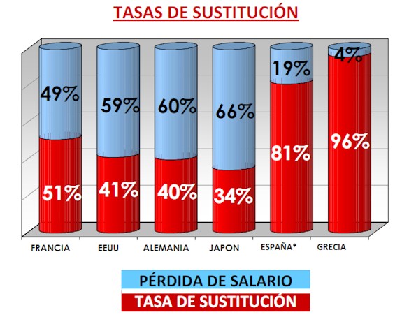El segundo capítulo de "obligaciones no financiadas" es el de las pensiones. Ya es posible calcular con bastante fiabilidad cuántos españoles alcanzarán los 65 ó 70 años en 2040 y 2050... y las cuentas no salen. La última reforma aprobada por el Gobierno reduce significativamente estos compromisos públicos (a costa de los bolsillos de los futuros pensionistas), pero a pesar de lo aprobado el sistema camina hacia una quiebra inevitable. España tiene uno de los sistemas públicos más ventajosos, con una tasa de sustitución (relación entre el último salario y la pensión) de más del 80%. Claro, esto hay que pagarlo y las cuentas comienzan a no salir.