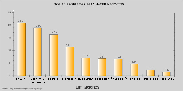 Según resultados de una encuesta del proyecto Enterprise Surveys del Banco Mundial, la mayor preocupación y problema al que se enfrentan los negocios en Guatemala es el crimen y la falta de seguridad. Esta encuesta, que recoge información a nivel de empresas en países en vías de desarrollo, pregunta cuáles son las 10 restricciones más importantes para las empresas en lo que se refiere al marco institucional en el que operan.