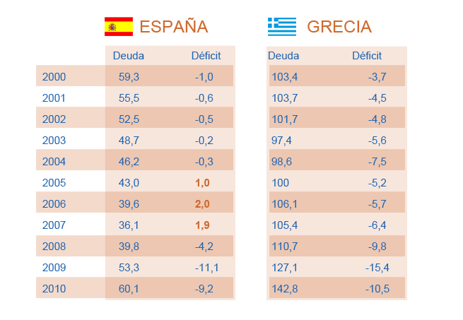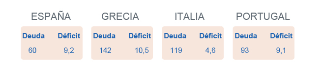 En realidad, la situación de España es sensiblemente mejor que la griega, la portuguesa o la italiana en algunos aspectos esenciales. Comparando su nivel de deuda (ver siguiente cuadro), puede verse que mientras Roma o Atenas deben por encima del 120% de su PIB, Madrid apenas llega al 60% (acabará el año en el 68% si se cumplen las perspectivas del Gobierno). De hecho, esta cifra es inferior a la de los grandes países de la UE, como Alemania o Francia.