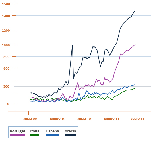 Los bonos helenos, lusos e irlandeses cotizaban por debajo de este límite hace apenas unos meses. Como puede verse en el siguiente gráfico, a comienzos de 2010, tanto la deuda de Portugal como la de Grecia estaban incluso por debajo de los 200 puntos de diferencial respecto a la alemana. Sin embargo, a partir de un momento dado (primavera para Atenas y otoño para Lisboa), se consolidó su situación por encima de los 300 puntos, lo que provocó una rapidísima escalada de su prima de riesgo, que obligó al rescate de ambos países.