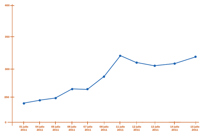 Sin embargo, a partir de ese primer día del mes de julio, se inició una cadena de subidas en la prima de riesgo española que iba a llevar a una tensión a los mercados como no se ha vivido, quizás, desde el comienzo de la crisis. El indicador pasó de esos 235 puntos a los 336 del lunes 11. Y la jornada del martes fue aún peor, con momentos en los que el diferencial se disparó por encima de los 380 puntos y minutos de auténtico pánico en los mercados. Afortunadamente, aquella situación crítica pasó y la prima se situó en el entorno de los 330 puntos. De esta manera, se volvía una calma muy tensa, con todos los inversores esperando con impaciencia los resultados de los test de estrés y la fallida cumbre del fin de semana en Bruselas (parece que finalmente se celebrará el próximo jueves), en la que se esperaba un acuerdo sobre el rescate a Grecia.