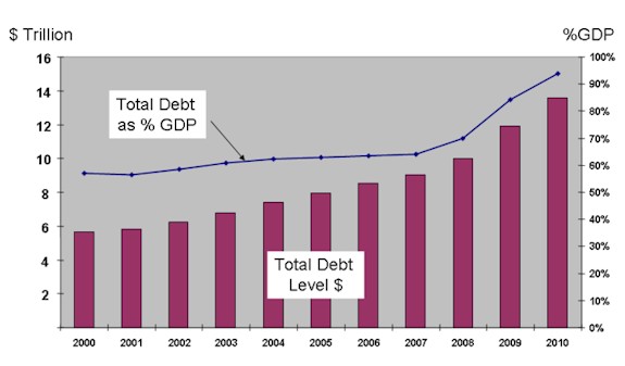 Lo primero que hay que dejar claro es que esta situación no era inevitable ni ha sido consecuencia de una sucesión de desastres divinos sobre los que no se tenía control. Como ocurre con muchos políticos intervencionistas, Barack Obama se presentó esta madrugada ante sus ciudadanos como una víctima inocente de las circunstancias, pero eso no es cierto. Cuando llegó al Gobierno, la deuda norteamericana suponía menos del 70% del PIB. En cuatro años, se ha disparado hasta cerca del 100% (ver gráfico). George W. Bush no fue precisamente un presidente austero. De hecho, en sus últimos tres años en la Casa Blanca generó déficits públicos del 1,9%, 1,2% y 3,2% respectivamente. Pero Obama ha superado con creces estos niveles y en los dos ejercicios que lleva en el cargo los números rojos han sido del 11,4% y 9,0% (y la previsión es del 9,3% y el 7,6% para 2011 y 2012).