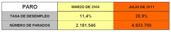 - Más paro: La destrucción de empleo ha sido el principal problema de Zapatero en los últimos años. Este viernes la Encuesta de Población Activa (EPA) situaba en junio la tasa de paro en el 20,89%. Esto significa que España tiene 4.833.000 parados, un dato escandaloso si se tiene en cuenta que cuando Zapatero entró en el Gobierno apenas se superaban los dos millones.