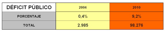 - Más déficit: Uno de los objetivos más ambiciosos del Gobierno es reducir el déficit público por debajo del 6% en 2011, después de haber cerrado los dos últimos ejercicios con unos números rojos del 11% y el 9%. Cuando el político castellano-leonés llegó a la Moncloa, el déficit para el conjunto de sus Administraciones Públicas era tan solo del 0,28% del PIB, una cifra imposible de imaginar a día de hoy.