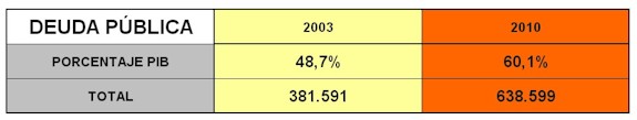 - La deuda, disparada: La afición de Zapatero por financiar al Estado mediante deuda es otra causa de la debilidad económica nacional. Mientras en el primer trimestre de 2004 España registraba un crecimiento de la deuda del 1,7% del PIB, el cuarto trimestre de 2010 se saldó con un 13,8%. De este modo, España debía a finales de 2010 casi 640.000 millones de euros, el 60% del PIB. Y todo indica que a lo largo de 2012 se llegará al 80%, incluso si se cumplen las optimistas previsiones del Gobierno.