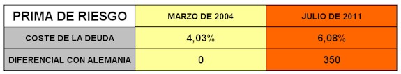 - Prima de riesgo: Hace dos semanas el rescate financiero de España estuvo más cerca que nunca en los mercados cuando la prima de riesgo española rozaba los 400 puntos básicos. Este escenario contrasta con el de 2004, cuando el diferencial entre el bono español y el alemán era de 0 (inexistente), y el coste de financiación era dos puntos menor incluso, aunque los tipos de interés eran algo más altos.