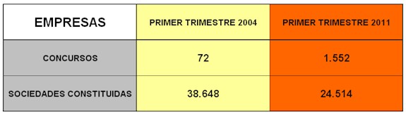 - Número de empresas concursadas: A través del concurso de acreedores las empresas ponen fin a su actividad. Al carecer de liquidez muchos empresarios se han declarado en una situación muy poco común hace siete años, la insolvencia. España ha descendido en todos los índices de libertad económica, entre otros motivos por el poco cariño que el Gobierno ha demostrado hacia los empresarios. En el primer trimestre de 2004 tan solo 72 se declararon en concurso, mientras que el mismo periodo de este año lo han hecho 1.552, un panorama empresarial bien diferente. También la creación de empresas se ha resentido: mientras que entre enero y marzo de 2004 se constituyeron casi 40.000 sociedades mercantiles, en el mismo período de 2011 apenas se llegó a las 24.000.