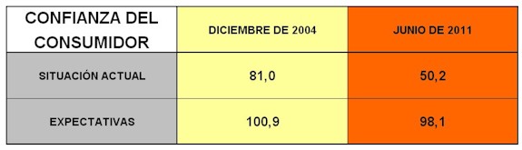 - Confianza del consumidor: Los propios consumidores han juzgado el trabajo del Gobierno en los últimos años. El índice de confianza que elabora el ICO es la mejor prueba de la falta de perspectivas de la economía espñaola. La percepción que los hogares tienen acerca del estado de su situación financiera personal y de España en general ha caído en más de 30 puntos desde 2004 y las expectativas sobre el futuro también están peor que hace siete años.