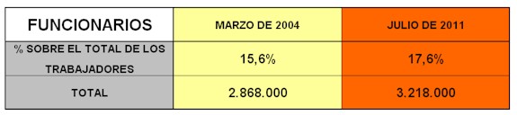 - Número de funcionarios: A pesar de la crisis, el número de funcionarios del Estado no ha parado de incrementarse, obviando así un principio básico en toda política de austeridad: reducir gastos. Si en 2004 la plantilla de la Administración Pública registraba a 2.868.000 de trabajadores en 2010 y en 2011 los empleados públicos llegan a los 3.218.000. Aunque en este incremento las CCAA tienen una buena parte de la responsabilidad, la política de José Luis Rodríguez Zapatero ha sido de constante incremento del gasto público y de la intervención de las administraciones públicas en la economía del país.