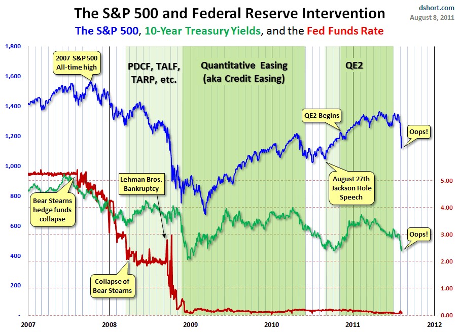 Otra señal que apunta al QE3 es la evolución de la bolsa de EEUU (S&P 500) desde el inicio de la crisis y cómo ha reaccionado a las sucesivas inyecciones monetarias de la Reserva Federal. Tal y como se muestra en el gráfico, el actual desplome bursátil es la excusa perfecta para volver a intervenir.