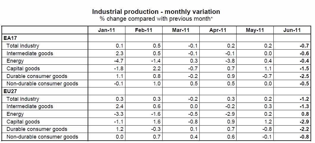 La caída de la actividad en Alemania arrastró consigo a la producción industrial de la zona euro, que se redujo inesperadamente un 0,7% respecto al pasado mayo, cuando creció un 0,2%. La mayoría de analistas esperaban que la producción se mantuviera invariable en junio.