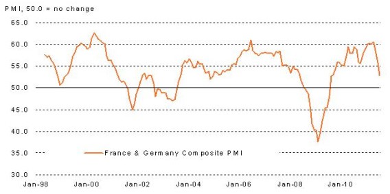 Todo ello indica una fuerte desaceleración económica en el seno de la Unión Monetaria. Y es que, el índice manufacturero compuesto de Francia y Alemania, las grandes potencias europeas, se ha desplomado en los últimos meses, tal y como muestra el siguiente gráfico. Este indicador refleja síntomas de contracción económica cuando desciende por debajo de 50 puntos básicos.