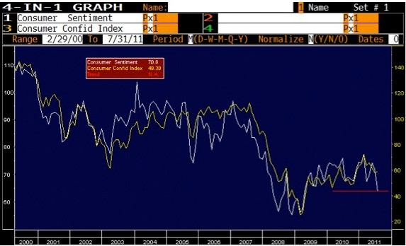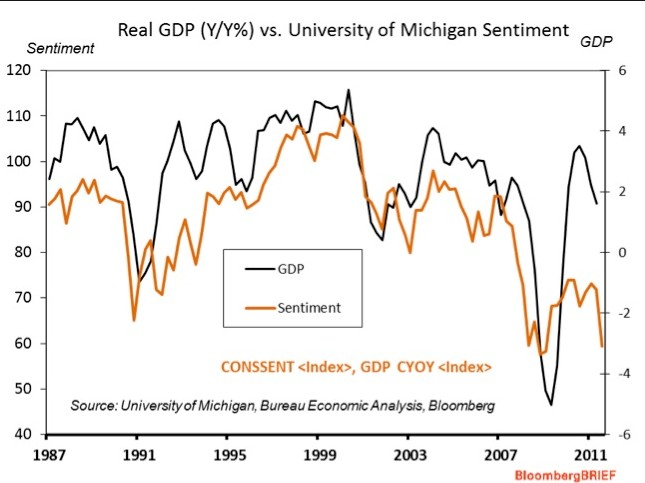 Aunque la economía estadounidense logró avanzar un 0,3% en el segundo trimestre respecto al primero, los analistas centran su atención en otros indicadores. Es el caso de la confianza del consumidor: el índice elaborado por Reuters y la Universidad de Michigan cayó en agosto hasta su nivel más bajo desde mayo de 1980; en concreto, descendió hasta los 54,9 puntos básicos, frente a los 63,7 de julio. La confianza del consumidor y el PIB muestran una elevada correlación desde hace 40 años, tal y como muestra el siguiente gráfico.