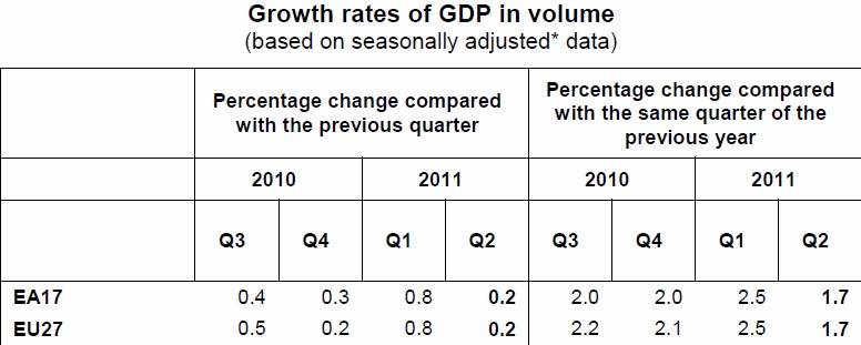 El Producto Interior Bruto (PIB) de la zona euro y de la UE apenas avanzó un 0,2% en el segundo trimestre respecto al anterior, cuando creció un 0,8% -cuatro veces menos-, lastrado por el frenazo de Alemania (0,1%) y Francia (0%), según los datos publicados este martes por la oficina europea de estadística, Eurostat. En términos interanuales, el crecimiento se situó en el 1,7%, por debajo del 2,5% registrado en el primer trimestre del año.