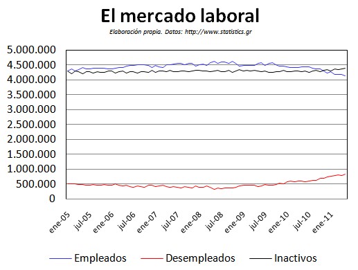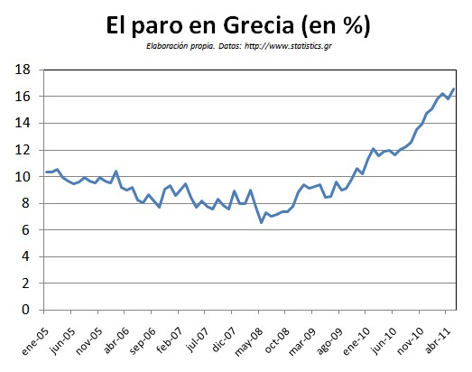 Tradicionalmente, durante el mes de mayo los datos empiezan a mostrar la mejoría correspondiente al inicio de la temporada turística veraniega. Pero este año, en promedio, unas 1.200 personas se sumaron cada día de mayo a las listas del paro, según la Autoridad Estadística Helénica (Elstat). Así, el nivel de desempleo se ha elevado hasta el 16,6%, el doble que hace dos años. La OCDE había previsto un paro del 16% para este año y del 16,4% para 2012.
