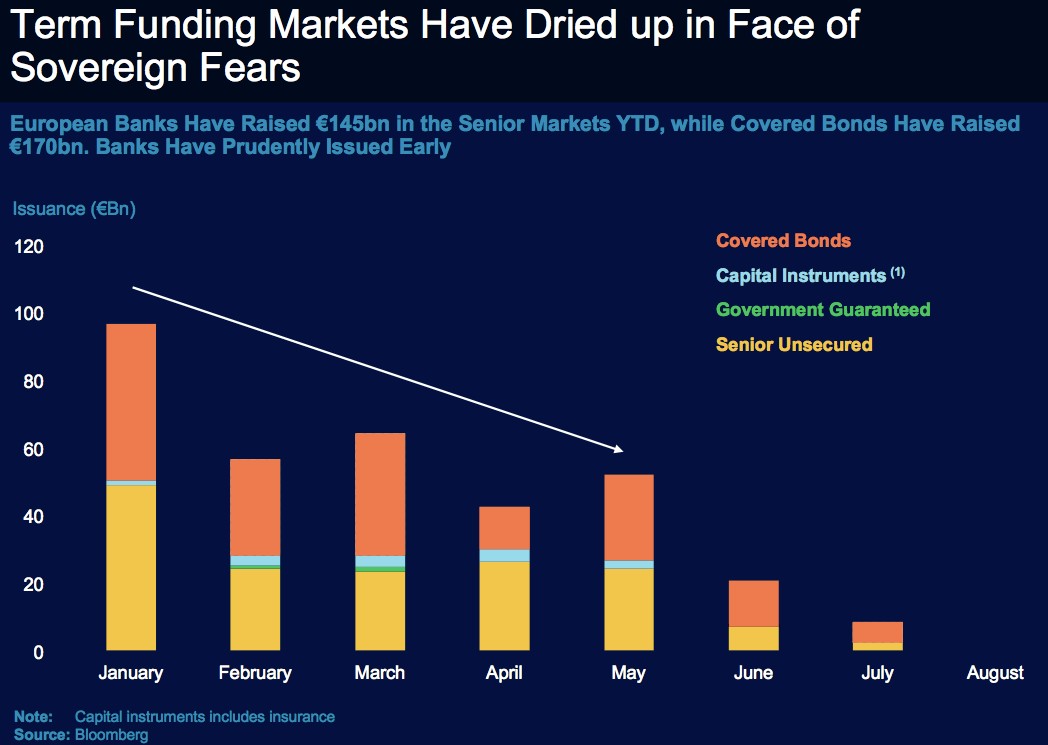El sector tenía previsto reanudar con fuerza sus emisiones este mismo otoño para cubrir los grandes vencimientos de 2012. Sin embargo, hoy por hoy, el mercado interbancario está congelado. "El muro de los próximos vencimientos de deuda garantizada por el gobierno es una preocupación, especialmente si la actual congelación del mercado se prolonga durante mucho más tiempo y se prolonga hasta 2012", según Martin Lukac, analista financiero Principal Global Investors.