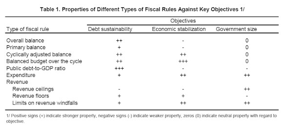 Un informe del Fondo Monetario Internacional (FMI) publicado en 2009 analiza cómo se han aplicado este tipo de reglas y la efectividad que han tenido en los diferentes países que las han aprobado. Básicamente hay cuatro tipos de reglas fiscales: las de equilibrio presupuestario; las de tope máximo de la deuda sobre el PIB; las de tope de gasto en la administración; y las de nivel máximo en los impuestos.