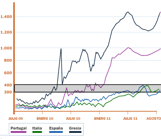 España e Italia caminaban con tranquilidad por debajo de los 200 puntos en su prima de riesgo hasta hace unos pocos meses. Sin embargo, poco después comenzaron a subir en una tendencia que les ha llevado a mantenerse mucho tiempo alrededor de los 300 puntos (incluyendo excursiones por encima de los 400, que se considera el límite por encima del que un país no puede estar mucho tiempo sin necesitar un rescate).