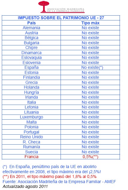 Como puede verse en la tabla inferior, sólo Francia mantiene el Impuesto de Patrimonio en toda la UE y, de hecho, lo ha reducido este año del 1,5% al 0,5%. Incluso, entre los países que han hablado de incrementar los impuestos a los ricos, como Portugal, ninguno ha planteado recuperar Patrimonio, sino que se buscan otras alternativas. Las razones son claras: por una parte, los grandes capitales saben cómo manejar sus fortunas para eludir lo más posible al Fisco. En España, fue habitual adscribir bienes (fincas, barcos, coches,...) a las sociedades, para así evitar el pago de este tributo. De ahí, precisamente, que este tipo de fiscalidad para ricos acabe finalmente sobre los hombros de la clase media enriquecida (profesionales que han dado un pequeño paso adelante en su profesión y que se ven penalizados por su éxito).