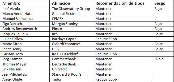 En concreto, tres de los quince miembros votaron a favor de una reducción inmediata de 50 puntos básicos en los tipos, hasta el 1%, aunque en su mayoría prevén que durante los próximos seis meses permanecerán en el 1,5% actual. De hecho, otros seis se mostraron favorables a que este mismo jueves el BCE anuncie que mantendrá los tipos en el nivel vigente, aunque aconsejan al presidente del organismo, Jean Claude Trichet, que se muestre abierto a bajarlos si sigue empeorando el ambiente económico. Cinco se mostraron a favor de que el banco central mantenga su actual política sin pronunciarse a favor ni de subidas ni de bajadas. Finalmente, un único miembro de los quince, Jörg Krämer, del Commerzbank, se decantó por mantener los tipos mostrando un sesgo a favor de subirlos.