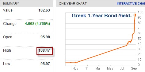 Mientras este debate se dilucida a nivel político, la rentabilidad del bono griego a un año se dispara hasta el 108%.