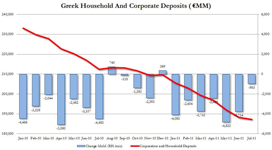La delicada situación de la banca griega se ha visto agravada por la constante fuga de depósitos que sufre en los últimos meses por parte de particulares y empresas. En concreto, el volumen total de depósitos bancarios ha caído desde los 233.000 millones de euros en enero de 2010 hasta apenas 187.000 el pasado julio (pinchar en la imagen para ampliar). Es decir, cerca de 46.000 millones de euros -el 20% de los depósitos- han huido del país.