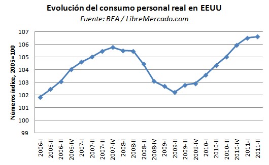 Sin embargo, esta visión adolece de graves problemas. El más importante de ellos es que no se ajusta a los datos, como ha vuelto a poner de manifiesto Robert Higgs, economista del Independent Institute. Así, las cifras muestran que el gasto por consumo personal real se ha recuperado e incluso superado los niveles máximos de antes de la crisis, tal y como se ilustra en el primer gráfico con datos trimestrales desde 2006 hasta el segundo trimestre de 2011.