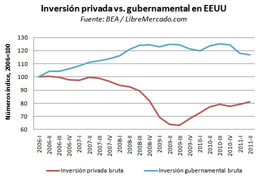 Asimismo, el gasto del Gobierno tanto por consumo como por inversión se mantiene en niveles más altos que en 2007. Por tanto, el mayor impedimento de la recuperación no es ni la atonía del consumo ni del gasto público sino la falta de dinamismo en la inversión privada, tal y como ha señalado Higgs en diversas ocasiones y se desprende de los datos. Una comparación gráfica entre la evolución desde 2006 de la inversión privada bruta gubernamental frente a la privada ilustra a la perfección este hecho.