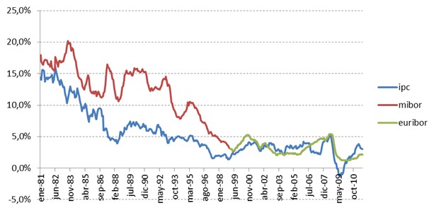 En el gráfico siguiente mostramos la evolución del Mibor, Euribor e inflación (IPC) de los últimos 30 años. El Euribor entró en vigor en enero de 1999, sustituyendo al Mibor como índice de referencia a nivel nacional. Es interesante ver cómo el diferencial entre índice de referencia (Euribor) e IPC anual ha sido negativo durante gran parte de la primera década de este siglo, algo improbable en el caso de tener un índice de referencia nacional (como se infiere por la serie histórica del Mibor).