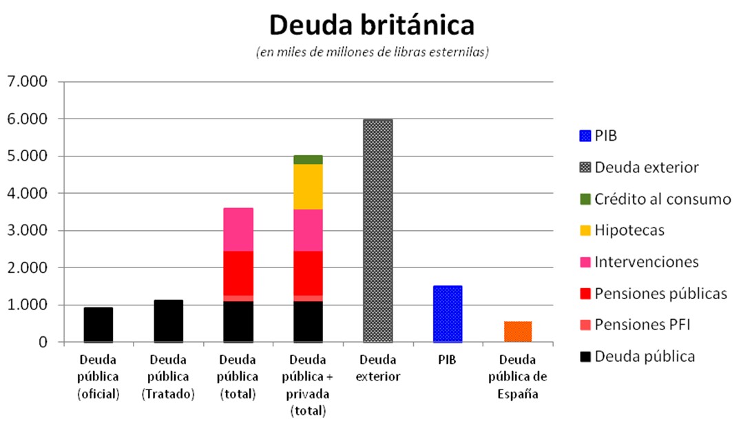 El primer problema se encuentra a la hora de determinar el verdadero volumen de la deuda británica. Los datos oficiales del Gobierno sitúan la deuda pública en 900.000 millones de libras esterlinas (1 billón de euros), lo que representa el 60% del PIB. Pero si se sigue el método del Tratado de Maastricht utilizado para los países de la zona euro se obtiene una deuda de 1,27 billones de euros -75% del PIB-.