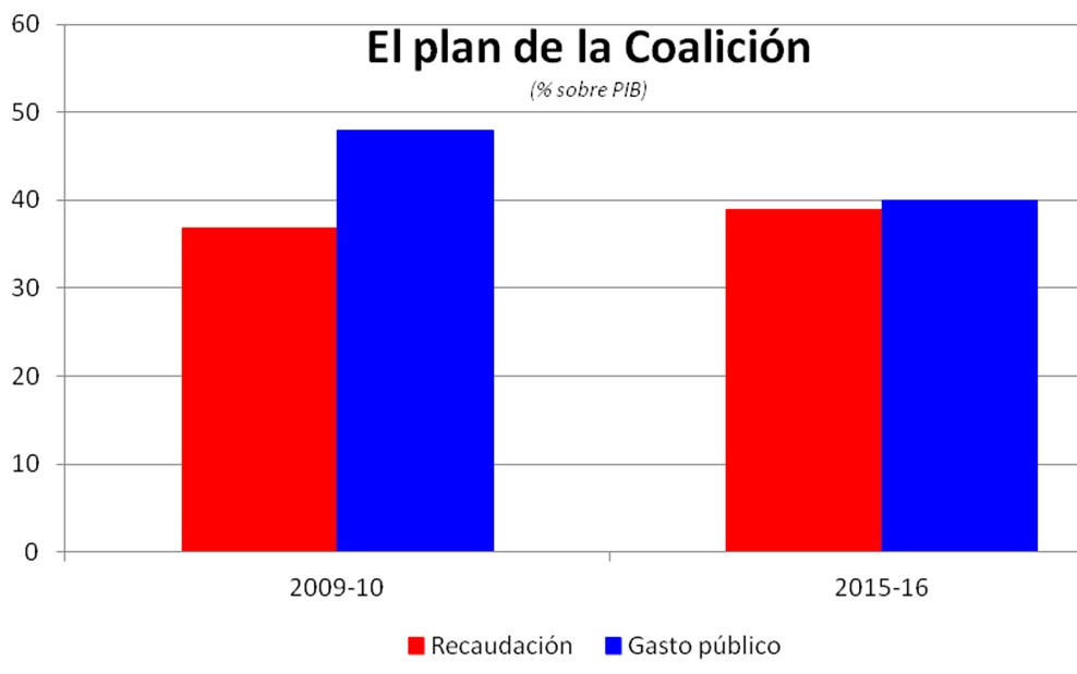 Para reducir el déficit, el Gobierno de coalición tiene un plan que consiste en "modestos recortes de gasto en términos reales y un gran aumento en los ingresos fiscales, que reducirá el déficit del 11,1% del PIB en 2009-10 al 1,6% en 2015-16".
