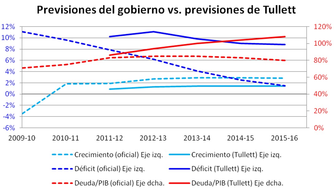 De los 182.000 millones de euros de déficit público que el Gobierno pretende reducir, más de la mitad (96.000 millones) provendrían de la recaudación de impuestos obtenida gracias al crecimiento económico. El problema de este plan, según Tullett, "es que depende de algunas suposiciones económicas bastante heroicas, principalmente, que se consiga crecer al 2,9% antes de 2012-13".