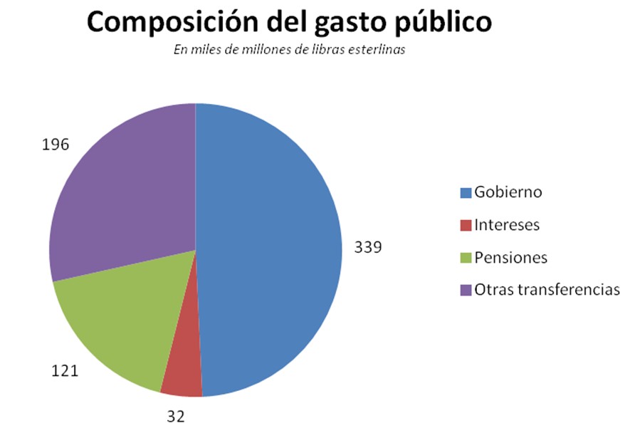 El gasto público se puede dividir entre el dinero que el Gobierno se gasta en sí mismo (339.000 millones de libras en 2009-10) y el dinero que entrega a otros (349.000 millones de libras). Esta segunda cifra puede desglosarse en los intereses (32.000 millones), pensiones públicas (121.000 millones) y otras transferencias (196.000 millones). Puesto que Londres ya ha anunciado que no aplicará recortes importantes ni en la sanidad ni en la ayuda externa, si las trasferencias quedan también igual en términos reales, ya sólo quedará margen para aplicar "reducciones muy dolorosas" concentradas en una pequeña franja de servicios "desprotegidos".
