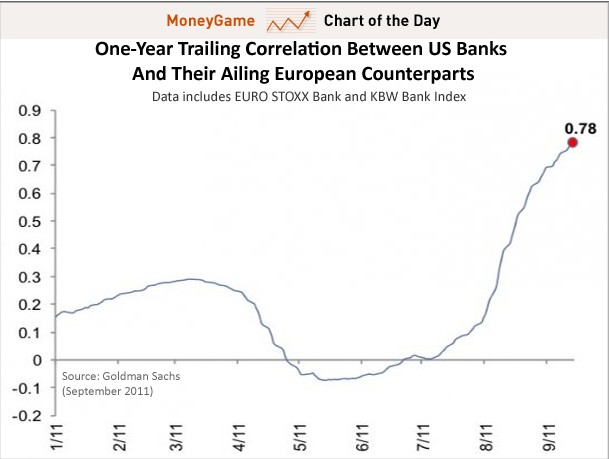 No en vano, tal y como muestra el siguiente gráfico de Goldman Sachs, la correlación que existe entre la cotización de los bancos europeos y estadounidenses se ha disparado en los últimos tiempos debido, precisamente, al temor de que la crisis de la zona euro impacte también en la banca de EEUU.