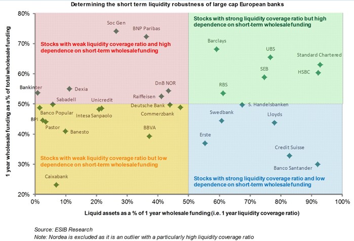 Y es aquí, precisamente, donde cobra especial interés el análisis elaborado por el banco luso Espirito Santo acerca de la liquidez y las necesidades de financiación a corto plazo (menos de un año) de la banca europea. El siguiente gráfico muestra que los galos SocGen y BNP y el belga Dexia son las entidades menos sólidas en este ámbito (cuadrante superior izquierdo) por ser las que tienen una mayor necesidad de financiación a corto plazo y un menor volumen de activos liquidables.