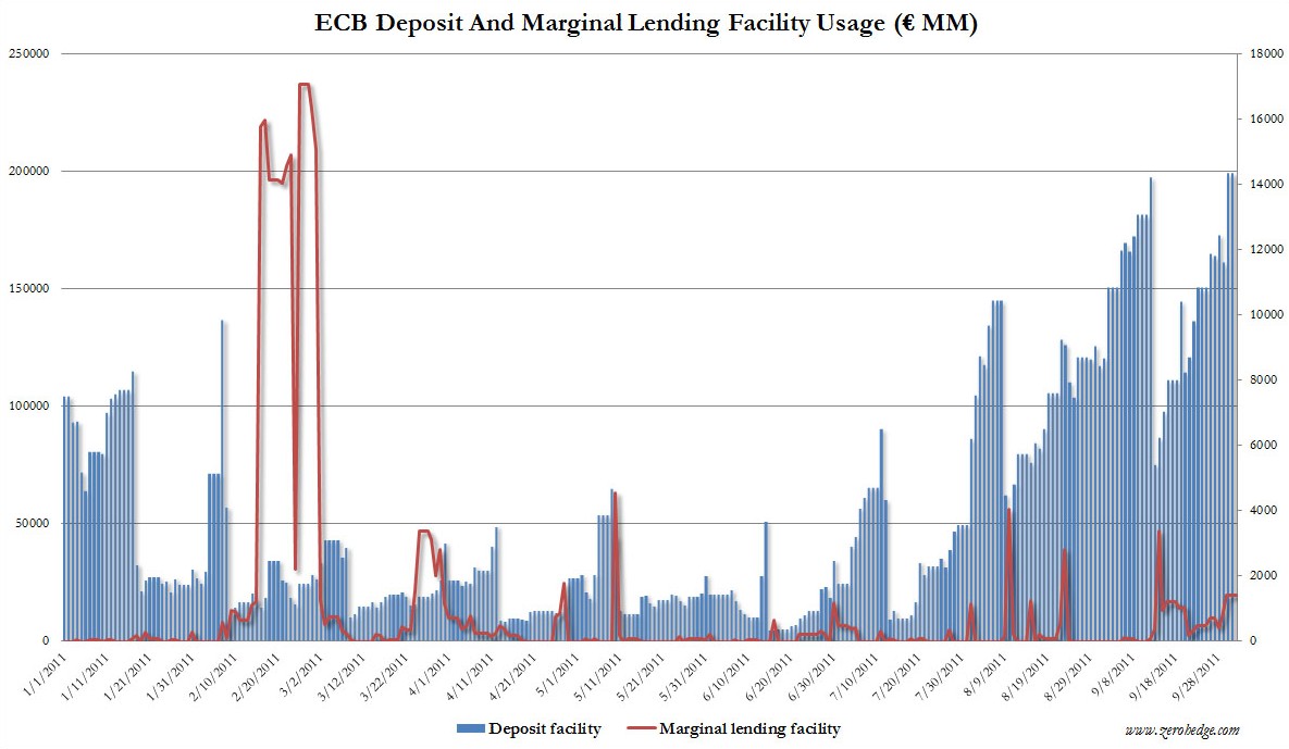 El aumento del uso de esta facilidad de depósito es una señal de que el mercado financiero no funciona correctamente. En condiciones normales, los bancos prestan estos excedentes a otras entidades en el interbancario a cambio de un determinado tipo de interés. Que lo mantengan en el BCE equivale, sin embargo, a dejarlo guardado en la caja fuerte, ya que la remuneración que ofrece el banco central por estos depósitos es mínima, muy inferior a la del interbancario. El uso de estos depósitos se ha disparado en las últimas semanas como consecuencia del agravamiento de la crisis de deuda pública europea. Ahora el nivel de desconfianza alcanza un nuevo máximo, síntoma de que los bancos dudan de la solvencia de otras entidades, de ahí que se refugien en el BCE.