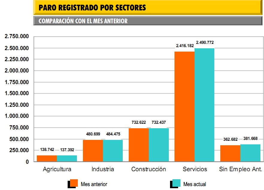 Por sectores económicos, el desempleo bajó sólo en la agricultura y la construcción, con 1.350 y 185 parados meses, respectivamente, mientras que subió en el resto, fundamentalmente en servicios, sector que sumó 74.590 parados más (+3,1%), aglutinando así cerca del 80% del repunte mensual del desempleo. En la industria, el paro subió en 3.776 (+0,8%), mientras que las personas sin empleo anterior aumentaron en 18.986 (+1,06%).