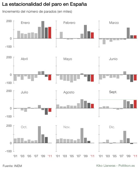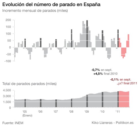 A lo largo de 2011 la evolución del paro ha sido semejante a la de 2010, lo que supone un aumento suave del desempleo, aunque septiembre se ha desviado -a peor- de esa tendencia. De este modo, es posible realizar el siguiente paralelismo, tal y como recoge el blog de Kiko Llaneras.