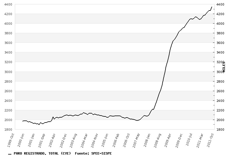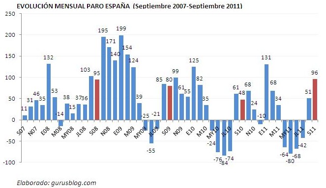 En primer lugar, cabe destacar el fuerte aumento del paro en septiembre. Según las cifras oficiales (sin aflorar por tanto el maquillaje estadístico), el número de parados registrados en los Servicios Públicos de Empleo (antiguo Inem) subió en 95.817 personas respecto a agosto (un 2,3% más), hasta un total de 4.226.744 desempleados (datos oficiales), y en 208.000 respecto a septiembre de 2010 (5,2%). Se trata del mayor repunte en un mes de septiembre desde 1996, año en el que arranca la serie histórica comparable. De hecho, este aumento casi duplica al registrado en septiembre de 2010, cuando subió en 48.102 personas.