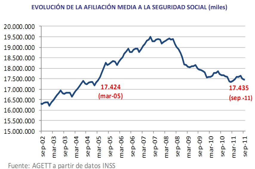 A ello se suma el hecho de que España sigue destruyendo empleo pese a los más de tres años de crisis. En concreto, la Seguridad Social perdió 64.956 afiliados respecto a agosto, aunque se trata de la segunda menor caída en un mes de septiembre desde que comenzó la crisis (julio de 2007). Esto supone la destrucción de casi 20.000 empleos más que la caída de afiliación registrada en septiembre de 2010. En los últimos doce meses, la afiliación se ha reducido en 235.918 cotizantes (-1,3%).