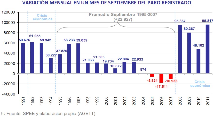 Otro dato relevante es que la actual crisis económica el desempleo se ha incrementado en una media de 61.744 parados en los meses de septiembre, mientras que en la anterior crisis 92-94 el desempleo aumentaba una media de 50.474 parados en los meses de septiembre.