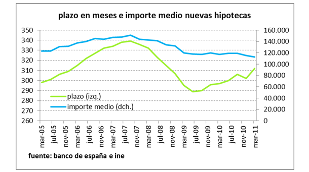 Esto, unido a los tres trimestres consecutivos de caída del precio de la vivienda en 2011, han provocado que cada vez se soliciten hipotecas de menor cuantía. No obstante, llama la atención el hecho de que desde mediados de 2009 esté creciendo de nuevo el plazo medio, que ha pasado de unos 290 meses (24 años y 2 meses) a más de 310 meses (25 años y 10 meses).