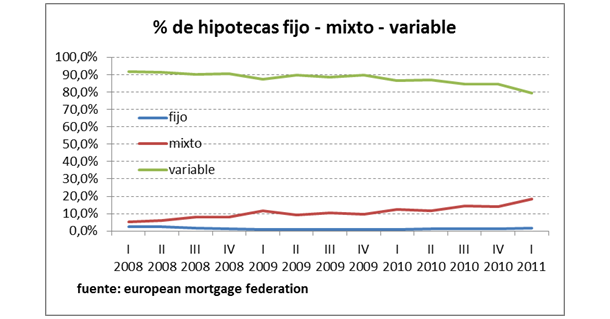 Ajustándose a la complicada situación económica y a la incertidumbre de los tipos de interés, las hipotecas mixtas se están incrementando en España, según informa el portal inmobiliario Idealista.com. Estas hipotecas combinan tipos de interés fijo y variable. Aunque aún no desbancan a las hipotecas tradicionales, están experimentando un notable crecimiento en los últimos años, así como el número de bancos que ofrecen estas fórmulas.