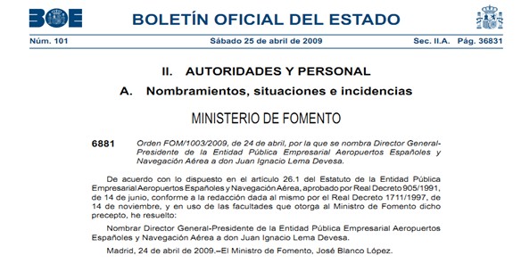 La cuestión es que durante seis meses el actual presidente de AENA simultaneó su cargo público con la presidencia de San José Tecnológicas, según consta en los documentos oficiales a los que ha tenido acceso Libre Mercado. El Ministerio de Fomento, con José Blanco a la cabeza, nombró a Lema nuevo presidente de AENA el 25 de abril de 2009, según recoge el Boletín Oficial del Estado (BOE).