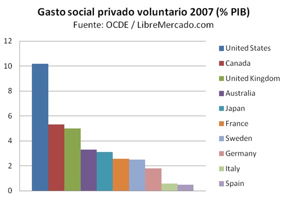 Conviene tener en cuenta, además, que el gasto social privado (caridad y filantropía) realizado voluntariamente en EEUU es sustancialmente más elevado que en otros países. Así, mientras que los norteamericanos dedican un 10,2% del PIB a estas partidas, el segundo país que le sigue dentro de la OCDE es Canadá, con el 5,3%; los españoles apenas dedican el 0,5%.
