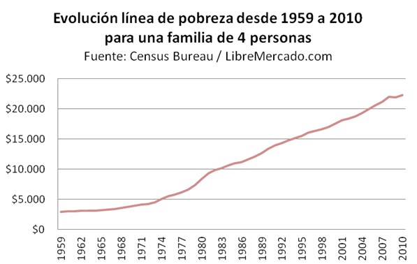 La Oficina del Censo norteamericano tiene 48 líneas de pobreza distintas que se aplican dependiendo del tamaño de la familia o el número de hijos menores de 18 años. En el siguiente gráfico mostramos la evolución de una de estas líneas de pobreza para una familia de 4 personas. Así, toda familia que reciba ingresos por debajo de esa línea será considerada "pobre". Pero, como es obvio, una familia pobre (en términos oficiales) en 2010 puede vivir realmente mucho mejor de lo que vivía una familia igualmente pobre en 1960 -estos ingresos están ajustados a términos reales, descontando la inflación-.